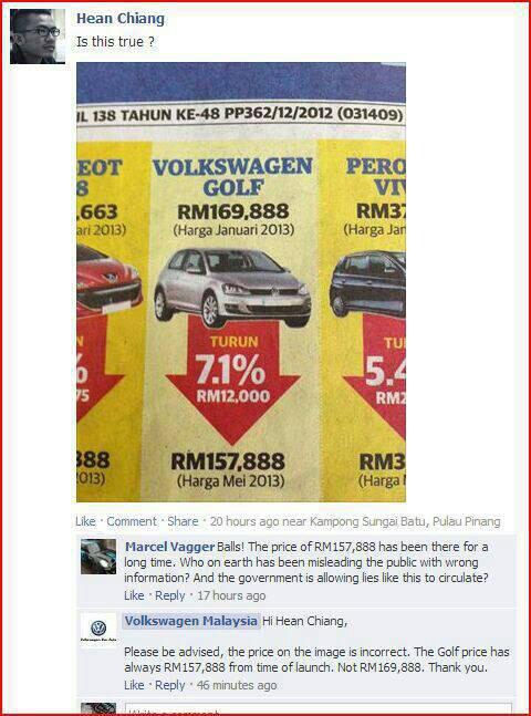seperti yang dilaporkan harga kereta telah turun adakah kerajaan yang menurunkan harga kereta itu atau akhbar sendiri yang pandai-pandai menurunkan harga kereta itu .. atausebaliknya .. Pandai-pandai la kita menilai sebenarnya kita telah banyak ditipu, jika kita tak mengkaji sendiri memang kebenaran tak akan muncul hanya akan nampak penipuan .. ini contoh akhbar yang menipu rakyat bahawa harga kereta telah turun.. Hakikatnya harga kereta semakin naik .. bukan turun. Volkswagen Malaysia sendiri menjelaskan penyataan tersebut..